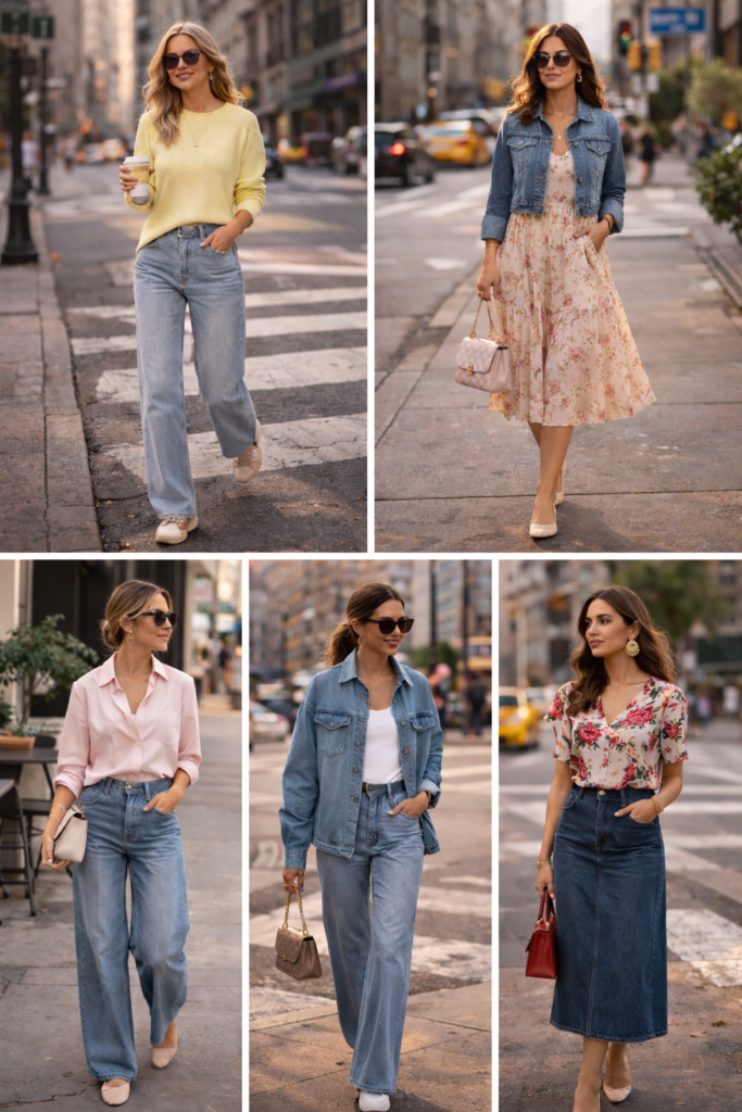 In New York City, where spring weather can swing from cold rain to sudden sunshine, reimagined denim shines in structured yet comfortable pieces. The hero item is the oversized denim shirt-jacket in a soft ecru or pale blue wash, worn over a lightweight floral blouse and wide-leg trousers. Add ballet flats or white sneakers and you have a look that transitions from a morning meeting in Midtown to an afternoon stroll through Central Park. Street-style photographers at NYFW captured countless versions of this formula: light-wash barrel jeans with a pastel cardigan tied at the waist and a trench draped over the shoulders for those breezy April days.