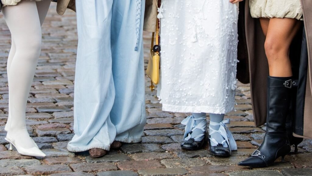 Shoes this season are all about comfort-meets-romance. The must-have is the ballet flat renaissance — now in soft pastel suede, floral embroidery, or woven textures that feel luxe and sustainable. Pair them with wide-leg denim or a breezy maxi dress for instant polish. Chunky sandals in buttery yellow or mint green (often with recycled straps) are everywhere, perfect for warmer days in Miami or Atlanta. White sneakers get a feminine upgrade with subtle floral details or pastel laces, making them ideal for sporty-feminine looks or layering over bike shorts and pleated skirts.
